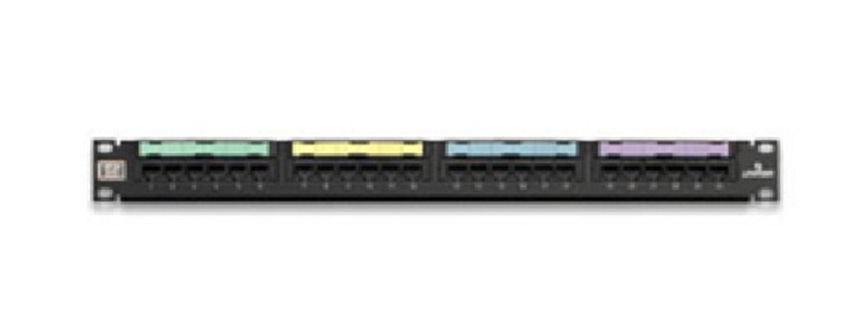 P/N 5G596-U24 Cat 5E Flat Patch Panel 24-Port 1Ru Black Cable Management Bar Included. Upc 078477178485