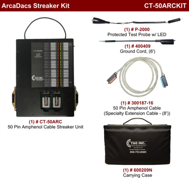 P/N Ct-50Arckit Tag Arcadacs Streaker Kit : 50 Pin Amphenol Cable Streaker Unit Test Kit Includes (1) Ct-50Arc 50 Pin Amphenol Cable Streaker Unit (1) 300187-16 50 Pin Amphenole Cable, 8 Ft (Specialty Ext. Cable) (1) 400409 Continuity Ground Cord, 6 Ft. (1) P-2000 Protected Test Probe With Led (1) 600209N Carrying Case