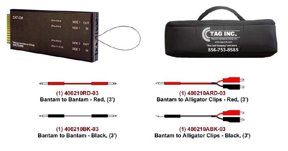 Part # Ext-238K3 T-1 Line Repeater Wiring Access Board (W/Bantam Jacks) Kit W/Cords Designed For Technicians Who Test At T1 Line Repeater Housings, Such As 818 Apparatus Cases. Kit Includes Ext-238 T1 Line Repeater Access Board 400210Rd-03, Bantam To Bantam-Red, 3 Ft 400210Bk-03, Bantam To Bantam-Black, 3 Ft 400210Ard-03 Bantam To Alligator Clips-Red, 3 Ft 400210Abk-03, Bantam To Alligator Clips-Black, 3 Ft 600209 Carrying Case