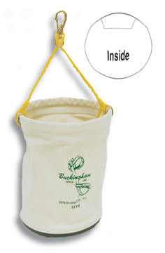 Buckingham 1215 Tool Bucket New Canvas Bucket Made With Heavy Canvas Construction. Solid Continuous Pvc Ring In Top And A Polypropylene Rope With 4958 Brass Swivel Snap. Features An 8" X 8" Inside Pocket And Has A Molded Rubber Bottom. 12" Dia. X 15" H.