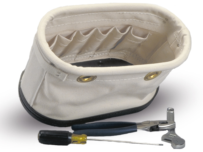 Product Details This Oval Shaped Tool Bag Hangs On The Aerial Lift Bucket With Attachment Hooks. There Is A Pvc Ring In The Top To Shape The Opening And Pvc Supports Onthe Sides To Keep The Bag Open.Fifteen Hand Tool Pockets On The Inside Of The Bag Organize Tools For Easy Access. Holes For Attachment Hooks Are Reinforced With Brass Grommets. The Bag Has A Sturdy Plastic Bottom With Drainage Holes.