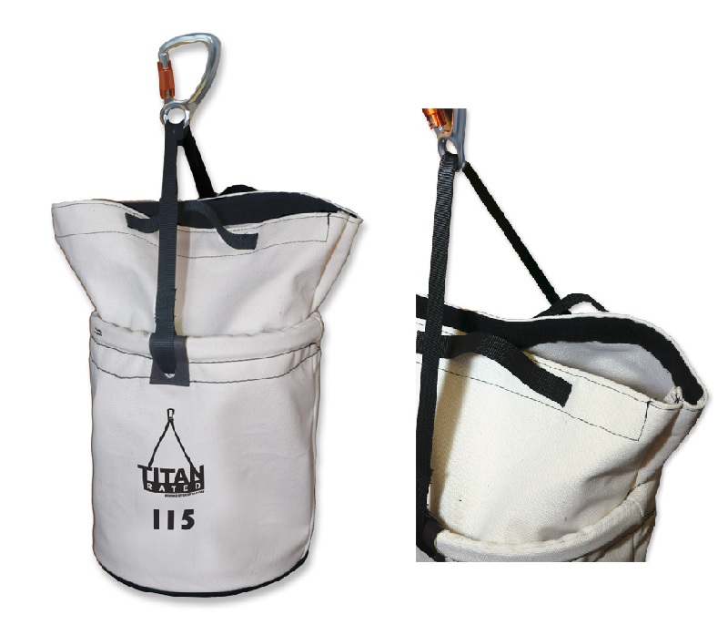 Part # 2075-1215Vc Titan Rated Canvas Bucket With Hook & Loop Closure Rated At 115 Lbs Working Load Limit Size 12" Dia X 15" H (Excluding Cover) Black Engineered Polymer Bottom With Drainage Holes Leather Reinforced Handle Attachment Points Polymer Ring In Top - Izod Impact Strength 0.65 Ft Lb/In Per Astm D256 Weight 3 Lbs. 15Oz.