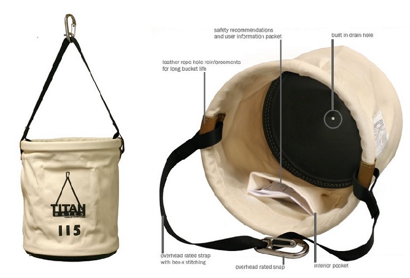 Part # 2075-1215 Description Tool Bucket Material Canvas Size 12 Inch X 15 Inch Weight 2 Lb 15 Oz 3Rd Part Load Rated At 115 Lbs Web Handle With Snap Plastic Base With Built-In Drain Hole