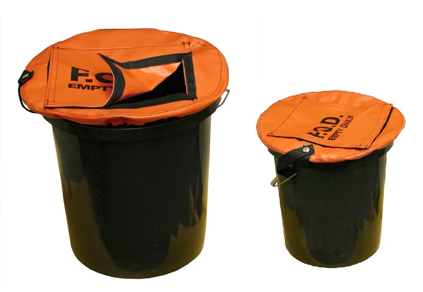 Secure Bucket Cover W/ Flap Top, Large Hook And Loop Flap Closure, Bungee Cord In Hem Orange Vinyl Coated Nylon Printed "Fod" This Cover Fits Over The Top Of Our #2019-18 Round Bag. Square Flap In The Top Fastens With Hook & Loop Closure. Easy Deposit Easy Empty. The Cover Has A Bungee Cord In The Hem To Secure It To The Top Of A Pvc Lined Bag Or A Bucket.