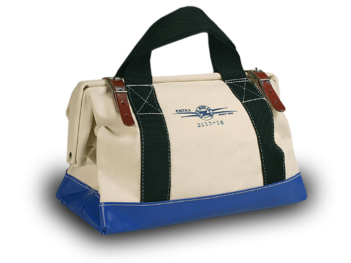 Product Details 2113 Series Tool Bags Are Constructed With Heavyweight #4 Canvas Duck. The Top Opening Has A Steel Frame To Keep The Bag Open And Provide Security When Closed. Two Leather Straps Secure The Opening. 2" Web Handles Wrap Around The Entire Bag For Added Strength. They Have A "Box X" Stitch At The Top For Extra Strength. The Bottom Is Reinforced With Heavy Vinyl Coated Nylon And Has A Double Tempered Masonite Board. Six Brass Studs Are Placed On The Bottom Of The Bag To Protect Against Abrasion.