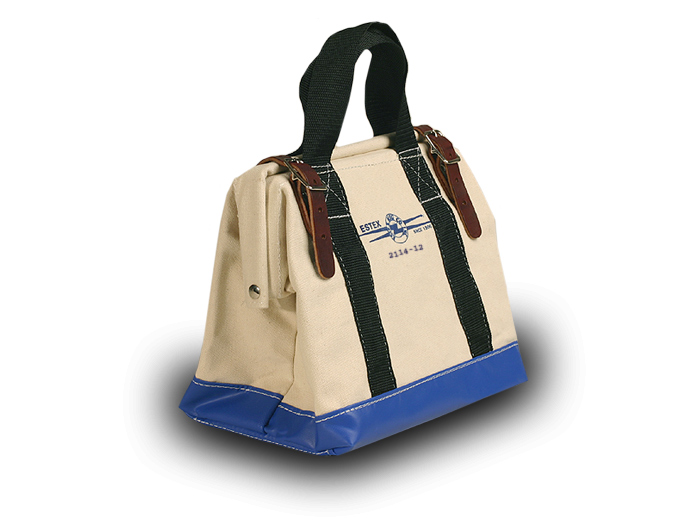 Product Details 2114 Series Tool Bags Are Constructed With #8 Canvas Duck. The Top Opening Has A Steel Frame To Keep The Bag Open And Provide Security When Closed. Two Leather Straps Secure The Opening. @" Web Handles Wrap Around The Entire Bag Fro Added Strength. They Have A "Box X" Stitch At The Top For Extra Strength. The Bottom Is Reinforced With Heavy Vinyl Coated Nylon And Has A Double Tempered Masonite Board. Six Brass Studs Are Placed On The Bottom Of The Bag To Protect Against Abrasion.