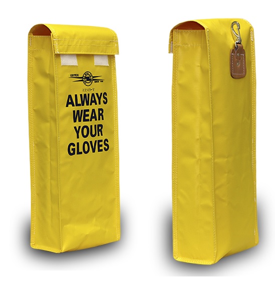 Part # 2249-V Description Glove Bag, Fr Vinyl With Leather Reinforcement Closure Hook And Loop Quick Release Snap On Back Color Yellow Size 20 Inch X 8 Inch X 4 Inch Weight 14 Oz This Bag Is Made From Yellow Fr Vinyl And Is Double Stitched On All Seams. There Is A Flap Over The Top With Hook & Loop Fasteners. On The Back There Is A Quick Release Snap For Attachment To Belt Which Is Reinforced Inside And Outside With Leather. Both The Snaps And Quick Release Snap Are Nickel Plated To Prevent Rust. The Rivets Are Capped To Prevent Scratching Of The Rubber Gloves. Grommets In The Bottom Provide Drainage. Stress Points Have Extra Stitching For Durability.