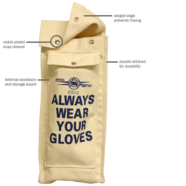 Product Details This Bag Is Made From #10 Canvas Duck And Is Double Stitched On All Seams. There Is A Flap Over The Top With Snap Fasteners. On The Back There Is A Quick Release Snap For Attachment To Belt Which Is Reinforced Inside And Outside With Leather. Both The Snaps And Quick Release Snap Are Nickel Plated To Prevent Rust. The Rivets Are Capped To Prevent Scratching Of The Rubber Gloves. Grommets In The Bottom Provide Drainage. Stress Points Have Extra Stitching For Durability. There Is A 6" X 11" Pocket On The Front Of The Bag For Goggles, Glove Dust, Safety Glasses, Etc.