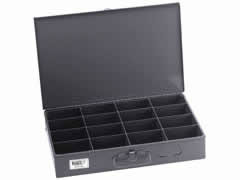 Klein Storage Boxes Are Offered With A Choice Of Compartment Sizes And Arrangements. Boxes Feature Strong, Rigid, Heavy-Duty Welded Construction. Full-Length Piano Hinged Covers Are Designed To Stay Open For Ease Of Access. Each Box Has A Carrying Handle, Positive Pull-Down Locking Catch. Boxes Have A Heavy, Metallic-Gray Baked-Enamel Finish. Box Compartments Feature High-Impact Styrene Construction. Scoop-Bottom Design For Easy Parts Removal And Cleaning. Fits Four-Drawer Extra-Large Slide Rack Cat. No. 54477.