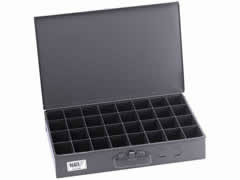 Klein Storage Boxes Are Offered With A Choice Of Compartment Sizes And Arrangements. Boxes Feature Strong, Rigid, Heavy-Duty Welded Construction. Full-Length Piano Hinged Covers Are Designed To Stay Open For Ease Of Access. Each Box Has A Carrying Handle, Positive Pull-Down Locking Catch. Boxes Have A Heavy, Metallic-Gray Baked-Enamel Finish. Box Compartments Feature High-Impact Styrene Construction. Scoop-Bottom Design For Easy Parts Removal And Cleaning. Fits Four-Drawer Extra-Large Slide Rack Cat. No. 54477.