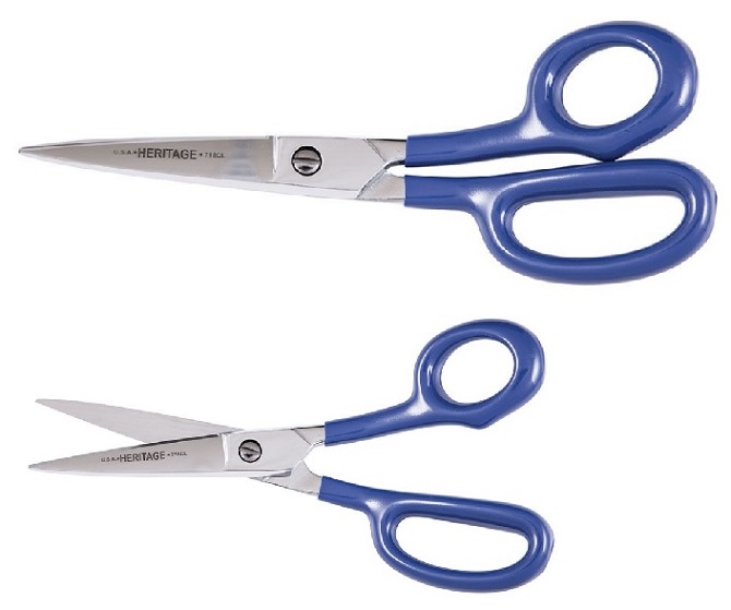 Specifications: Blade Curvature: Curved Blade Edge: Knife Blade Material: Carbon Chrome Over Nickel Plated Blade Tip: Standard Brand: Heritage Handed: Right Handle Orientation: Straight Handle Material: Plastisol Coated Length Of Cut: 3'' Overall Length: 8 5/8'' Tension Adjustment: Screw Inside Ring Size (In.): N/A Country Of Origin: Usa