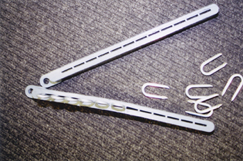 Holds 10 Staples. Slots Are 1/8" W X 1" L. The Overall Dimensions Are 7/8" X 3/4" X 14 1/4" And The Diameter Of The Hole To Hang The Stick Is 1/2".