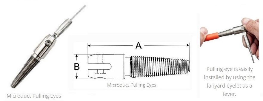 These Rugged Stainless Steel Pulling Eyes Allow Microduct Placement To Become A Faster, Safer Operation. Easy Insertion By Rotating The Pulling Eye Into The Microduct Allows The Tapered Buttress Threads To Make The Connection Each Unit Is Supplied With A Galvanized Steel Lanyard. Three Lengths Are Available. Use Pulling Eyes With Different Lanyard Lengths For Staggard Pulling Multiple Ducts At Once The Lanyard’S Eyelet Acts As A Built-In Installation Tool The Sizes Are Based On The Microduct’S Inside Diameter (I.D.)