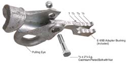 Hubbell Power Systems E-96 Standard Pulling Eye New This Inexpensive Cost-Cutter Provides A Large Offset Eye To Accommodate Three-Ton Chain Hoist Hooks, And Leaves The Anchor Eye Free With Plenty Of Clearances For Attaching Formed Wire Grips. By Removing The Adapter Bushing, The E-96 Pulling Eye Fits 11/4" Rods. The E-96 Pulling Eye Is Inexpensive And Easy To Use. One Person Can Assemble And Hook Up In Minutes. For Working Loads To Approximately 6,000 Pounds (Ultimate Strength — 18,000 Pounds).