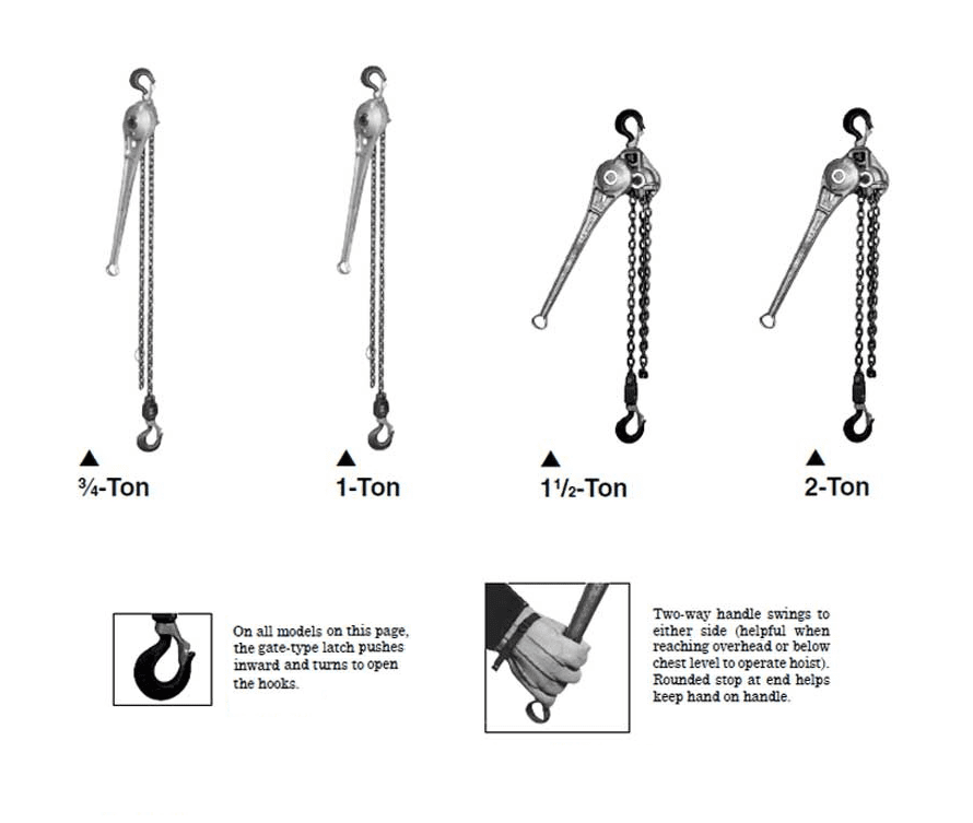 Ab Chance C309-0439 1 1/2 Ton Chain Hoist New Aevery Chance Hoist Is Proof-Tested And Factory-Operated At 150% Of Capacity Rating. Lightweight High-Strength Handle And Sheave Housings Are Heat-Treated Aluminum. All Working Parts Are Fully Enclosed In The Housing Unit To Protect The Hoist Mechanism And To Cover The Gearing For Worker Safety. Chain Is High-Strength Alloy Steel, Polished For Smooth Action And Low Wear. Load Hooks Are Forged Steel With Spring-Loaded Latches. Both Top And Bottom Hooks Swivel 360° To Allow For Unwinding Action Of Rope Or Stranded Cable Under Tension. For Easy Hook-Up, Chain Release To Freewheel But Only Under No-Load Conditions. Controls Automatically Lock When Hoist Is Pulling A Load. Two Simple Levers . . . Shift Key For Up And Down, On Top Housing, And Release Key In Handle Recess . . . Are Easy To Switch, Even Wearing Gloves. Simply By Ratcheting One Or Two Clicks Per Stroke In Up Or Down Mode, Operator Can Choose Quick Speed Of A Full Link Or Half-Link Rate For Extra Accuracy. For Cramped-Quarters Work, Ratchet Handle Swings To Either Side. This Provides Option Of Push Or Pull Stroke To Best Suit Conditions And Preferences. Each Unit Comes With An Illustrated Operating Manual, Includes Complete Parts List. Lifetime Oil-Impregnated Bronzesleeve Bearings Require No Additional Lubrication. Normal Low Maintenance Calls For Only Routine Inspection. Pliers And Screwdriver Are The Only Tools Needed. For Infrequent Repairs, Kit C309-0349 Contains Minor Service Parts Common To All Ratings.
