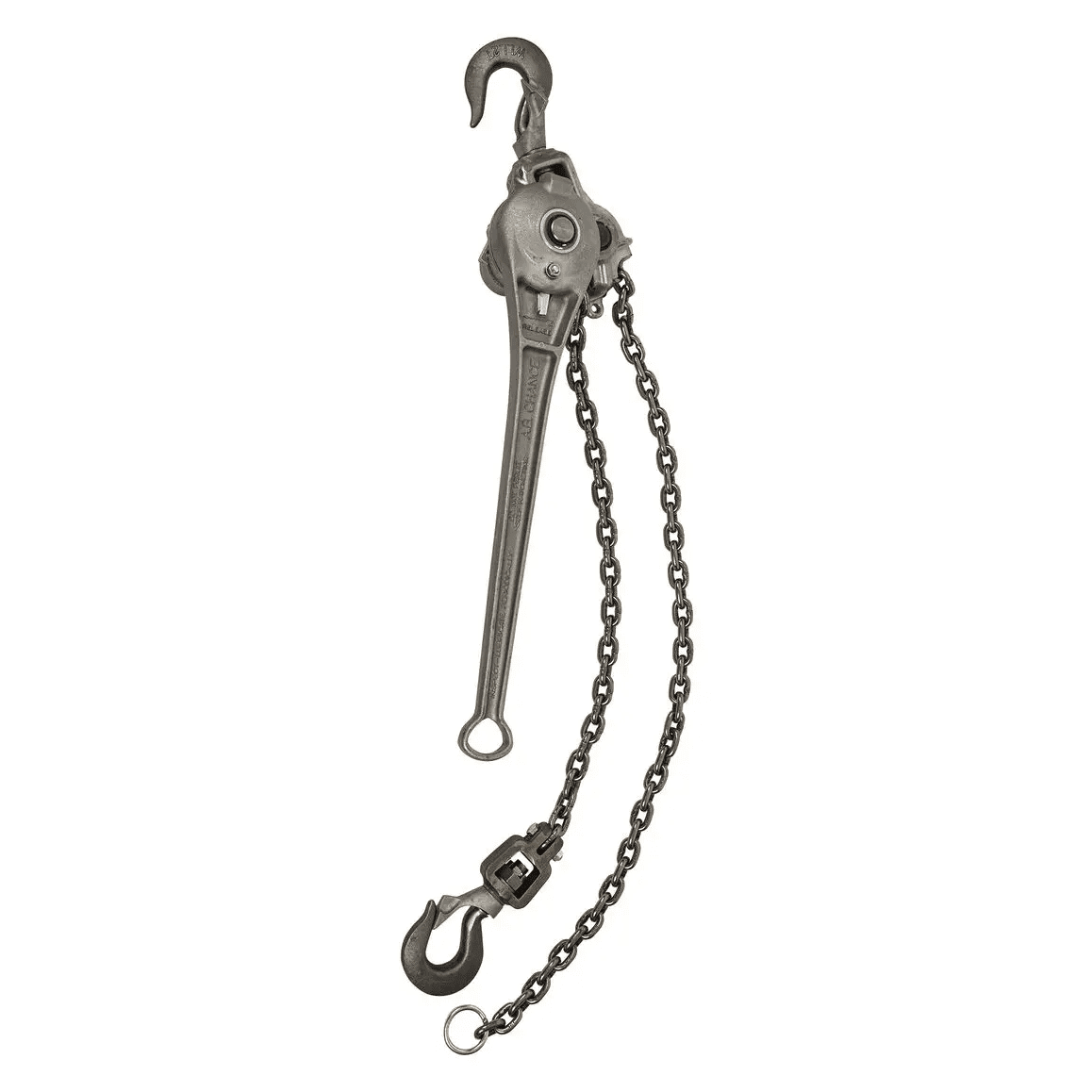 Link-Chain Style A Strong Link To Reliable Performance. Construction Proof-Tested And Factory Operated At 150% Of Capacity Rating Lightweight, High-Strength Handle And Sheave Housings Are Heat-Treated Aluminum All Working Parts Are Fully Enclosed In The Housing Unit For Operator Safety High-Strength Alloy Steel Chain Is Polished For Smooth Action And Low Wear Load Hooks Are Forged Steel With Automatic Spring-Loaded Latches Two-Way Handle Allows For Easy Access And Operation Overhead Or Below Chest Level Rounded Stop On Handle End Helps To Ensure Firm Operator Grip. Operation Easy Hook-Up And Chain Release To Freewheel, Under Noload Conditions Controls Automatically Lock When Hoist Is Pulling Load Two Simple Levers – Shift Key For Up And Down On Top Of Housing, And Release Key In Handle Recess – Are Easy To Switch, Even Wearing Gloves Easily Ratchets One Or Two Clicks Per Stroke In Up Or Down Mode Choose Quick Speed, Or Full- Or Half-Link Rate For Added Accuracy Ratchet Handle Swings To Either Side For Cramped Quarters And Push Or Pull Stroke Operation Top And Bottom Hooks Swivel 360° For Rope Unwinding Or Stranded Cable Under Tension Specifications Each Unit Comes With Illustrated Operating Manual, Including Complete Parts List Lifetime Oil-Impregnated Bronze-Sleeve Bearings Require No Additional Lubrication Pliers And Screwdriver Are Only Tools Needed For Maintenance For Infrequent Repairs, Kit C3090349 Contains Minor Service Parts Common To All Ratings 5-1/2 Ft. Standard Lift Distance 20-In. Handle/Aluminum Housing