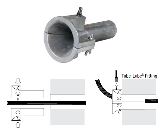 The Dcd Split Entry Bell Is Designed To Allow Continuation Of A Single Cable Pull Through A Manhole - Out One Side And Into Another Side. The Split Feature Allows Removal Of The Guide After Installation. Split Bells Are Available In Long Wearing Bronze Or Lower Cost Aluminum. Bronze Bell Halves Are Held Together With Wing Nuts And Bolts While The Aluminum Bells Use Dowel Pins And One Lug Has A 3/4 Inch Dia. Lifting Hole. Add An L To The End Of The Part Number To Order The Entry Bell Complete With A Lube Fitting For The Dcd Tube-LubeŽ 326 Applicator Systems.