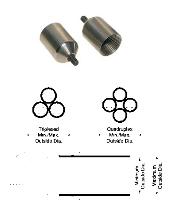 This Product Is Designed To Be Threaded Onto The Lead End Of A Group Of Either Triplex Or Quadplex Cables So That They Can Be Pushed Through Short Lengths Of Ducting. The Basic Pushing Eye Comes With Only The Body And A Shoulder Bolt. There Are Several Different Attachments Which Can Be Threaded Onto The Bolt And These Must Be Purchased Separately. These Include Some Of The Accessories Used With Our Duct Rodders Such As The Pulling Eye, The Clevis End And The Roller Guide As Well As A Standard Eye Nut. Any Of These Can Act As A Leader For The Pushing Eye. Each Size Of Pushing Eye Can Be Used To Attach To Different Groups Of Cable. Because The Cables Can Be In Different Quantities And Diameters, The Range For Each Pushing Eye Is Determined By The Diameter Around The Group Of Cables. This Information Is Available On The Data Supplied By The Cable Manufacturer Or It Can Be Measured Using The Diagram Below As A Guide.