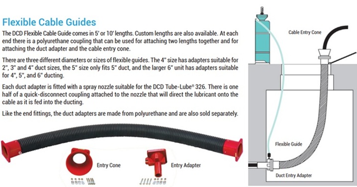 The Dcd Design/Cable Spinning Equipment Flexible Cable Guide Comes In 5 Ft Or 10 Ft Lengths. Custom Lengths Are Also Available. At Each End There Is A Polyurethane Coupling That Can Be Used For Attaching Two Lengths Together And For Attaching The Duct Adapter And The Cable Entry Cone. There Are 3 Different Diameters Or Sizes Of Flexible Guides. The 4" Size Has Adapters Suitable For 2", 3" And 4" Duct Sizes, The 5" Size Only Fits 5" Duct And The Larger 6" Unit Has Adapters Suitable For 4", 5" And 6" Ducting. Each Duct Adapter Is Fitted With A Spray Nozzle Suitable For The Dcd Design/Cable Spinning Equipment Tube-LubeŽ 326. There Is One Half Of A Quick-Disconnect Coupling Attached To The Nozzle That Will Direct The Lubricant Onto The Cable As It Is Fed Into The Ducting. Like The End Fittings, The Duct Adapters Are Made From Polyurethane And Are Also Sold Separately.