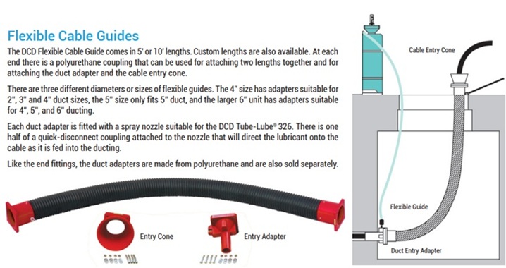The Dcd Design/Cable Spinning Equipment Flexible Cable Guide Comes In 5 Ft Or 10 Ft Lengths. Custom Lengths Are Also Available. At Each End There Is A Polyurethane Coupling That Can Be Used For Attaching Two Lengths Together And For Attaching The Duct Adapter And The Cable Entry Cone. There Are 3 Different Diameters Or Sizes Of Flexible Guides. The 4" Size Has Adapters Suitable For 2", 3" And 4" Duct Sizes, The 5" Size Only Fits 5" Duct And The Larger 6" Unit Has Adapters Suitable For 4", 5" And 6" Ducting. Each Duct Adapter Is Fitted With A Spray Nozzle Suitable For The Dcd Design/Cable Spinning Equipment Tube-LubeŽ 326. There Is One Half Of A Quick-Disconnect Coupling Attached To The Nozzle That Will Direct The Lubricant Onto The Cable As It Is Fed Into The Ducting. Like The End Fittings, The Duct Adapters Are Made From Polyurethane And Are Also Sold Separately.