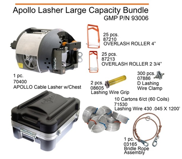 Qty. P/N Description Total Weight (1) 70400 Apollo Cable Lasher W/Chest 53 Lbs. (24Kgs.) (25) 87210 Overlash Roller 4 Inches 25 Lbs. (11.33) (25) 87213 Overlash Roller 2.75 Inches 25 Lbs. (11.33) (2) 08605 Lashing Wire Grip 1.25 Lbs. (0.57Kg) (300) 07886 D Lashing Wire Clamp 15 Lbs. (20.41Kg) (10) 71530 Carton6/Ct (60 Coils) Lashing Wire 65 Lbs.(29.49Kg) (1) 03165 Bridle Rope Assembly 3 Lbs. (1.4 Kgs)