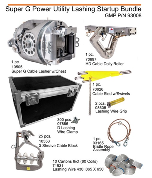 Qty. P/N Description 1 10505 Super G Cable Lasher W/Chest 1 70697 Hd Cable Dolly Roller 1 70626 Cable Sled W/Swivels 2 08605 Lashing Wire Grip 300 07886 D Lashing Wire Clamp 25 10553 3-Sheave Cable Block 1 03165 Bridle Rope Assembly 10 Cartons 6/Ct (60 Coils) 71531 Lashing Wire 430 .065 X 650 Ft.