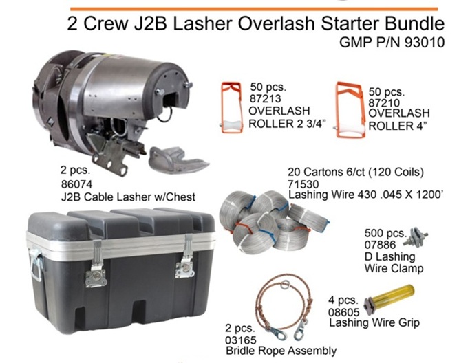 Includes: Qty. P/N Description Total Weight (2) 86074 J2B Cable Lasher W/Chest 65 Lbs. (50) 87213 Overlash Roller 2.75 Inches 50 Lbs. (50) 87210 Overlash Roller 4 Inches 50 Lbs. (20) 71530 Cartons 6/Ct (120 Coils) Lashing Wire 130 Lbs. (500) 07886 D Lashing Wire Clamp 75 Lbs (4) 08605 Lashing Wire Grip 2.5 Lbs. (2) 03165 Bridle Rope Assembly 6.0 Lbs.