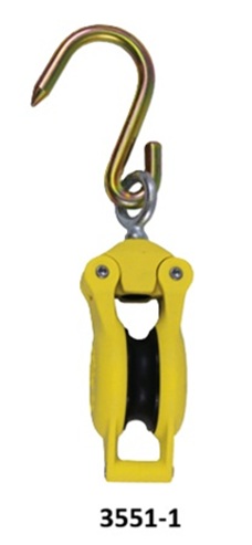 Closed Block With Swivel Meat Hook O Block And Sheave Constructed Of Rugged Nylon Fiberglass Reinforced High Dielectric Material O Reinforced 1/2" Diameter Axle And Swivel Bearings O 3" Sheaves - Block Can Accommodate Rope Up To 5/8" Diameter O Provided With Either Side Opening Or Closed Block O Blocks Are Rated With 3-1 Safety Factor O Working Load Limit 1,000 Lbs
