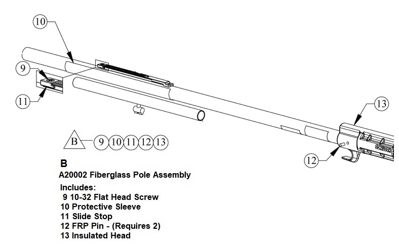 Catalog # A20002 Fiberglass Pole Assembly Includes: #9 10-32 Flat Head Screw #10 Protective Sleeve #11 Slide Stop #12 Frp Pin - (Requires 2) #13 Insulated Head