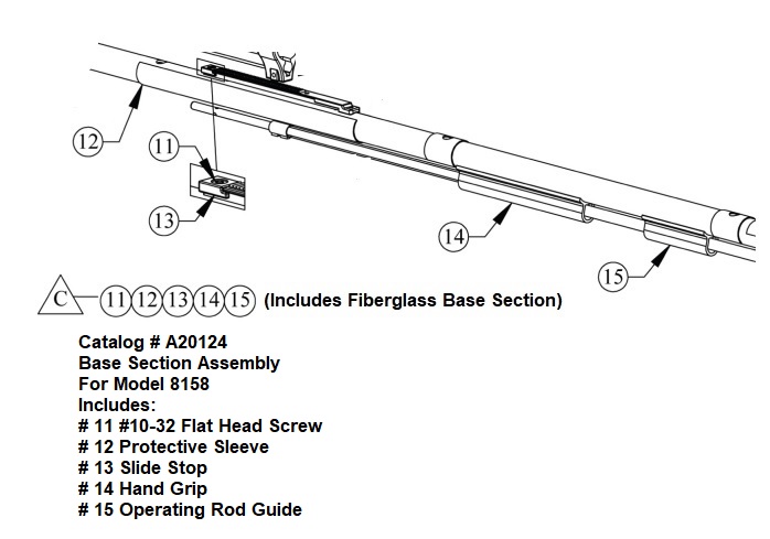 Catalog # A20124 Base Section Assembly For Model 8158 Includes: # 11 #10-32 Flat Head Screw # 12 Protective Sleeve # 13 Slide Stop # 14 Hand Grip # 15 Operating Rod Guide