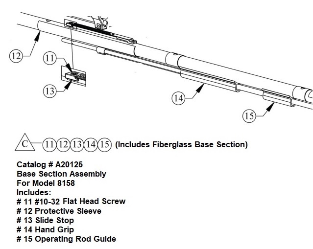 Catalog # A20125 Base Section Assembly For Model 8158-80 Includes: # 11 #10-32 Flat Head Screw # 12 Protective Sleeve # 13 Slide Stop # 14 Hand Grip # 15 Operating Rod Guide