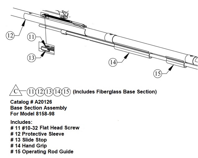 Catalog # A20126 Base Section Assembly For Model 8158-98 Includes: # 11 #10-32 Flat Head Screw # 12 Protective Sleeve # 13 Slide Stop # 14 Hand Grip # 15 Operating Rod Guide