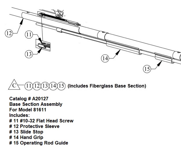 Catalog # A20127 Base Section Assembly For Model 81611 Includes: # 11 #10-32 Flat Head Screw # 12 Protective Sleeve # 13 Slide Stop # 14 Hand Grip # 15 Operating Rod Guide