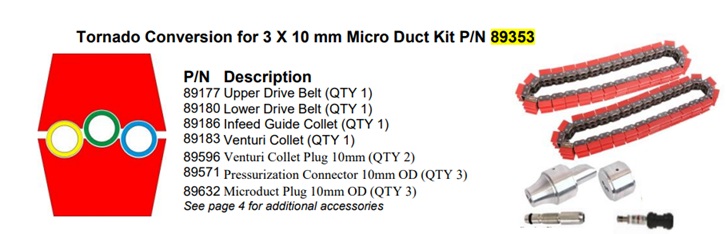 P/N 89353 Gmp General Machine Products Tornado Conversion For 3 X 10 Mm Micro Duct Kit For Tornado Blower Includes: P/N Description 89177 Upper Drive Belt (Qty 1) 89180 Lower Drive Belt (Qty 1) 89186 Infeed Guide Collet (Qty 1) 89183 Venturi Collet (Qty 1) 89596 Venturi Collet Plug 10Mm (Qty 2) 89571 Pressurization Connector 10Mm Od (Qty 3) 89632 Microduct Plug 10Mm Od (Qty 3)