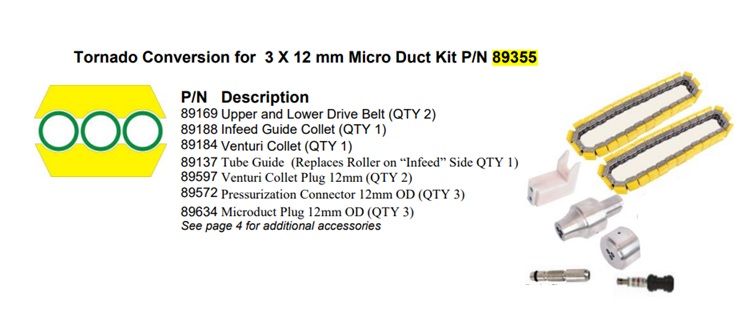 P/N 89356 Gmp General Machine Products Tornado Conversion For 3 X 12 Mm Micro Duct Kit For Tornado Blower Includes: P/N Description 89169 Upper And Lower Drive Belt (Qty 2) 89188 Infeed Guide Collet (Qty 1) 89184 Venturi Collet (Qty 1) 89137 Tube Guide (Replaces Roller On “Infeed” Side Qty 1) 89597 Venturi Collet Plug 12Mm (Qty 2) 89572 Pressurization Connector 12Mm Od (Qty 3) 89634 Microduct Plug 12Mm Od (Qty 3) See Page 4 For Additional Accessories