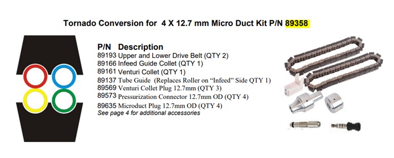 Includes: P/N Description 89193 Upper And Lower Drive Belt (Qty 2) 89166 Infeed Guide Collet (Qty 1) 89161 Venturi Collet (Qty 1) 89137 Tube Guide (Replaces Roller On Infeed Side (Qty 1) 89569 Venturi Collet Plug 12.7Mm (Qty 3) 89573 Pressurization Connector 12.7Mm Od (Qty 4) 89635 Microduct Plug 12.7Mm Od (Qty 4)