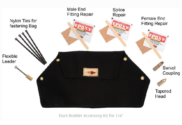 P/N 89424 Accessory Kit For 1/4" Duct Rodder Weight 1 Lb. (0.45 Kg) Includes P/N Description 89371 Flexible Leader 89380 Swivel Coupling 89350 Tapered Head 89411 Male End Repair Kit 89417 Splice Repair 89412 Female End Repair Kit 32645 Tie Wraps 32646 Canvas Pouch