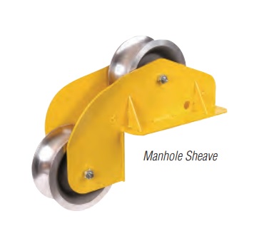 The Manhole Sheave Or “Pittsburgh” Is Used To Guide Pulling Line Or Cable Over The Manhole Edge When Placing And Removing Cable In Manholes Which Are Equipped With Pulling In Irons To Support A Sheave And Shackle Assembly. Consists Of A Reinforced, Heat-Treated Wrought Aluminum Alloy Frame With Two Self-Lubricating, Bronze Bushed Aluminum Sheaves The Frame Also Has A Hole In Each Side Plate So You Can Insert A 1 1/4 In. (32Mm) Dia. Digging Bar Parallel To The Ground To Keep The Sheave From Being Knocked Into The Manhole Approximate Overall Unit Dimensions: 30 In. (762Mm) L X 12 In. (305Mm) W X 22 In. (559Mm) H Sheaves Are Available To Accommodate Cable Up To 3 In. (76Mm), 4 In. (100Mm) Or 5 In. (130Mm) Diameters Standard Units Are Rated At 7,500 Lbs. (3.3Kn) The 80975 Heavy Duty 5 In. Model Is Rated For 10,000 Lbs. (4.4Kn)
