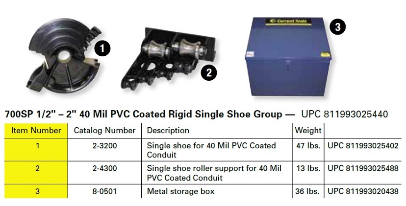 Part # 700Sp Description 1/2" - 2" 40 Mil Pvc Coated Rigid Single Shoe Group Upc 811993025440 Weight 96 Lbs. Includes The Following: