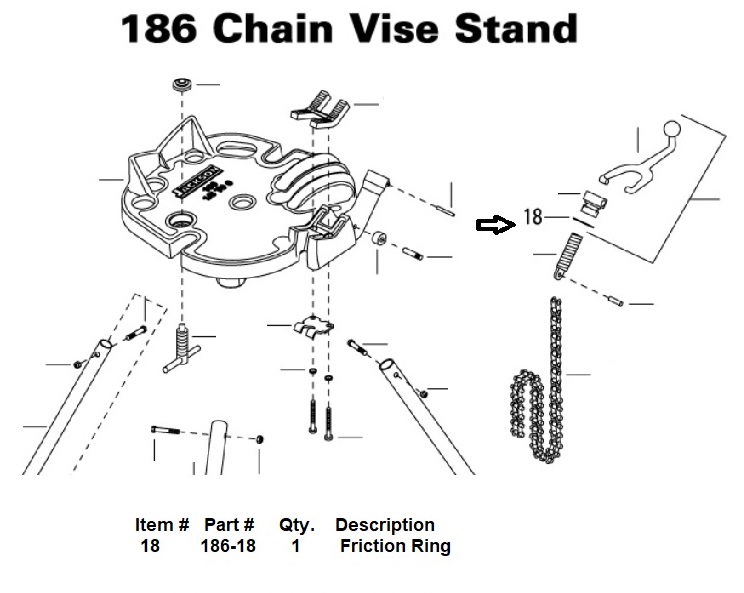 Part # 186-18 Description: Friction Ring Upc 811993024771 Replacement Friction Ring From The 186 Chain Vise Stand Item # Part # Qty. Description 18 186-18 1 Friction Ring