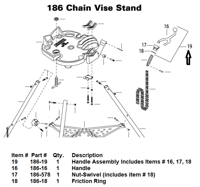 Part # 186-19 Description: Handle Assembly Upc 811993024788 Replacement Handle Assembly From The 186 Chain Vise Stand Item # Part # Qty. Description 19 186-19 1 Handle Assembly Includes Items # 16, 17, 18 16 186-16 1 Handle 17 186-578 1 Nut-Swivel (Includes Item # 18) 18 186-18 1 Friction Ring