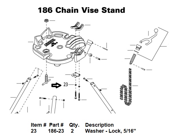 Part # 186-23 Description: Washer - Lock, 5/16" Qty. 2 Upc 811993024832 Replacement Washer - Lock, 5/16" Part Of The 186 Chain Vise Stand Item # Part # Qty. Description 23 186-23 2 Washer - Lock, 5/16"