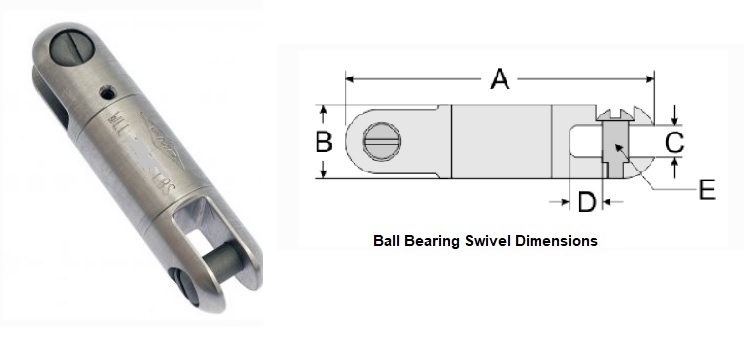P/N 71137 Ball Bearing Swivel Working Load Limit Under Ground 5,000 Lbs. (22.2Kn) Working Load Limit Aerial 3,000 Lbs. (13.3Kn) Eye Width 17/32 In (13.5Mm) Repl. Pin # 33156 Hex Weight .95 Lbs (.43 Kg) Dimensions: A 4.75 In. (120.6Mm) B 1.24 In. (31.5Mm) C .53 In. (13.5Mm) D .53 In. (13.5Mm) E .399 In. (10.1Mm)