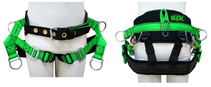 One accessory ring for first aid Two accessory loops Forged medium dee rings Interlock leg strap buckles Suspender connection loop Medium size dee rings (5000 lbs.) 7" tuff duck covered back support with one layer of rigidity Friction buckles for easy adjustability and positive locking Multiple adjustments for an ideal center of gravity Two rugged and versatile handsaw snaps Heavy-duty elastic extensions for leg pads or batten seat