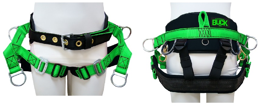 One accessory ring for first aid Two accessory loops Forged medium dee rings Interlock leg strap buckles Suspender connection loop Medium size dee rings (5000 lbs.) 7" tuff duck covered back support with one layer of rigidity Friction buckles for easy adjustability and positive locking Multiple adjustments for an ideal center of gravity Two rugged and versatile handsaw snaps Heavy-duty elastic extensions for leg pads or batten seat