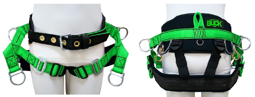 One accessory ring for first aid Two accessory loops Forged medium dee rings Interlock leg strap buckles Suspender connection loop Medium size dee rings (5000 lbs.) 7" tuff duck covered back support with one layer of rigidity Friction buckles for easy adjustability and positive locking Multiple adjustments for an ideal center of gravity Two rugged and versatile handsaw snaps Heavy-duty elastic extensions for leg pads or batten seat