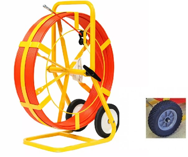 400 Ft. Of 3/8-Inch Diameter Fiberglass Rod Marked Every 5 Ft. (Metric Every 1M) Ideal For 2" - 4" Conduit 7" Bend Radius 1,000-Lb Pull/Tensile Strength Frame Handle And Wheels For Transport Friction Brake And Safety Roller Feed Operates Vertically Or Horizontally Canvas Pouch Accessory Kit Included: Pulling Eye, And End Ferrule Dimensions: 39" X 32" X 18"