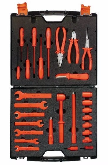 Insulated Hand Tools From Jameson Provide Maximum Electrical Protection And Are Suitable For Working Live Or Close To Live Parts At Nominal Voltages Up To 1,000 Volts. Constructed Using Heavy-Duty Injection Molded Nylon 11; They Are Ideal For Use In A Wide Variety Of Utility, Electrical, And Telecommunication Applications. Kit Comes With A Tool Case And Includes (1) 8 In. Combination Pliers, (1) 8 In. Long-Nose Pliers, (1) 6-1/4 In. Side-Cutting Pliers, (1) 3/8 In. Open-End Wrench, (1) 7/16 In. Open-End Wrench, (1) 1/2 In. Open-End Wrench, (1) 9/16 In. Open-End Wrench, (1) 5/8 In. Open-End Wrench, (1) 11/16 In. Open-End Wrench, (1) 3/4 In. Open-End Wrench, (1) 3/8 In. 1/2-In. Drive Socket, (1) 7/16 In. 1/2-In. Drive Socket, (1) 9/16 In. 1/2-In. Drive Socket, (1) 5/8 In. 1/2-In. Drive Socket, (1) 11/16 In. 1/2-Drive Socket, (1) 3/4 In. 1/2-In. Drive Socket, (1) 3/16 In. 1/2-In. Drive Hex Key Socket, (1) 1/4 In. 1/2-In. Drive Hex Key Socket, (1) 1/2-In. Drive Ratchet Wrench, (1) 5-In. Long 1/2-In. Drive Socket Extension, (1) 10-In. Long 1/2-In. Drive Socket Extension, (1) Cable Jointers Coring Knife, (1) No. 1 X 3 In. Phillips Screwdriver, (1) No. 2 X 4 In. Phillips Screwdriver, (1) 1/8 In. X 3 In. Slotted Terminal Screwdriver, (1) 5/32 In. X 3 In. Slotted Terminal Screwdriver, (1) 3/16 In. X 6 In. Slotted Electrician Screwdriver And (1) 5/16 In. X 6 In. Slotted Electrician Screwdriver.