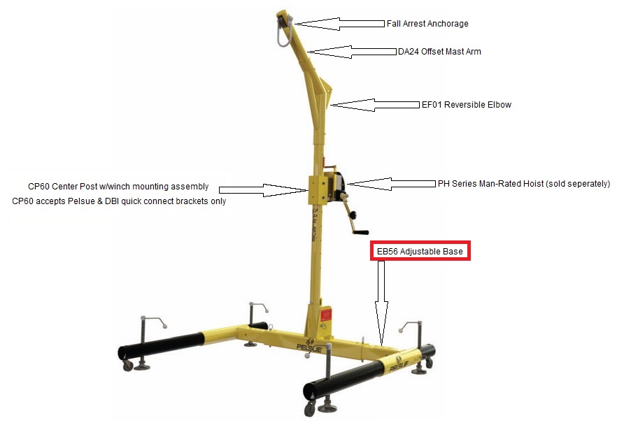 Pelsue Eb56 Davit System Base - Adjustable 36" To 56” Inside Width New Made Of 6061-T6 Powder Coated Aluminum. The Three Piece Base Is Available In Two Models: 36” To 56” Inside Diameter And 46” To 66” Inside Diameter. Units Are Only To Be Used With The Dk1824 Offset Arm. Proof Loaded To 5,000 Lbs. With A 24” Offset (Note: Maximum Offset Cannot Exceed 24”). Certified To Osha Regulations & Ansi Z359 Standards. Base Features Screw Legs For Adjustment On Uneven Terrain And Base Wheels Which Allow For The Unit To Be Moved From One Site To Another Without Disassembling The System. Sleeve Comes With Abs Liner And Pvc Slip Plate.