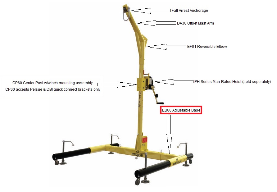 Pelsue Eb66 Davit System Base - Adjustable 46" To 66” Inside Width New Made Of 6061-T6 Powder Coated Aluminum. The Three Piece Base Is Available In Two Models: 36” To 56” Inside Diameter And 46” To 66” Inside Diameter. Units Are Only To Be Used With The Dk1824 Offset Arm. Proof Loaded To 5,000 Lbs. With A 24” Offset (Note: Maximum Offset Cannot Exceed 24”). Certified To Osha Regulations & Ansi Z359 Standards. Base Features Screw Legs For Adjustment On Uneven Terrain And Base Wheels Which Allow For The Unit To Be Moved From One Site To Another Without Disassembling The System. Sleeve Comes With Abs Liner And Pvc Slip Plate.